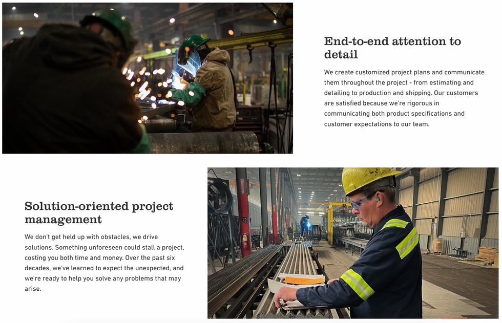 I worked alongside a Marketing Consultant who was building brand materials for a newly merged steel company called Valley Joist + Deck. They were looking to revamp their brand image in an effort to capitalize off of phenomenal customer feedback and institutional loyalty among their workforce. We helped them craft website copy that reflected the feedback they had provided; that they are a no-nonsense, honest & efficient company that values their employees and goes the extra mile for their clients.